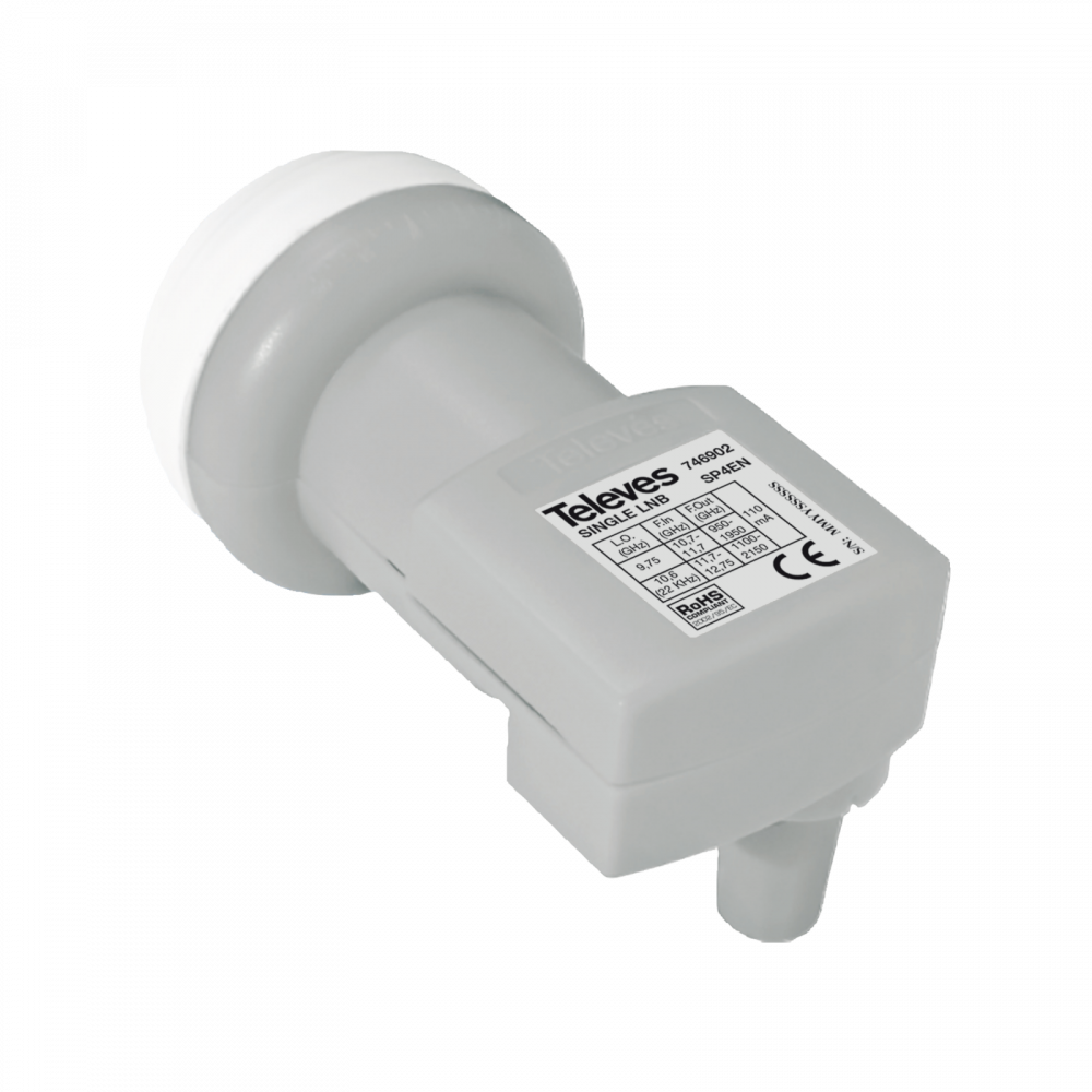 Konwerter LNB Single universal z jednym wyjściem z czterema kombinacjami polaryzacja/pasmo (Hh, Hl, Vh, Vl).